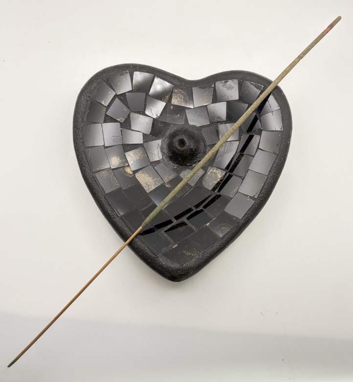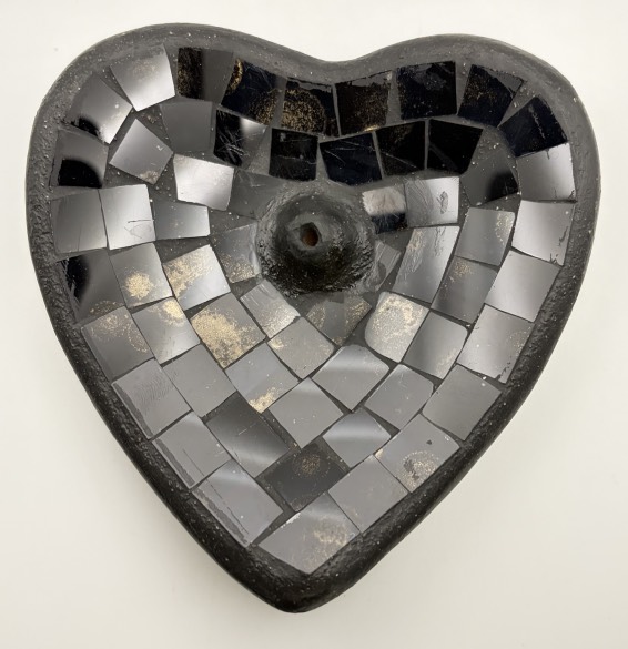 Porta incenso in ceramica nera e vetri a forma di cuore cm. 11 x 12.