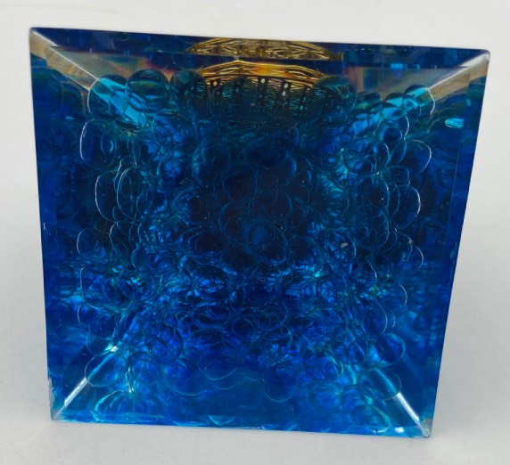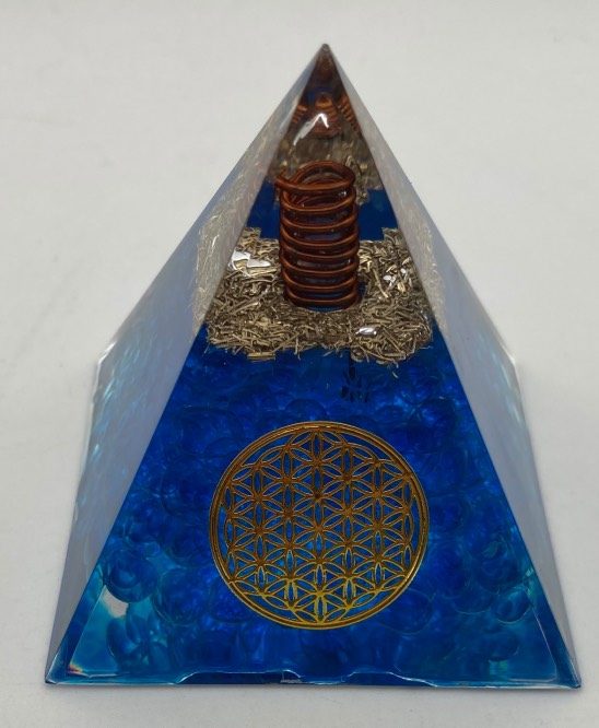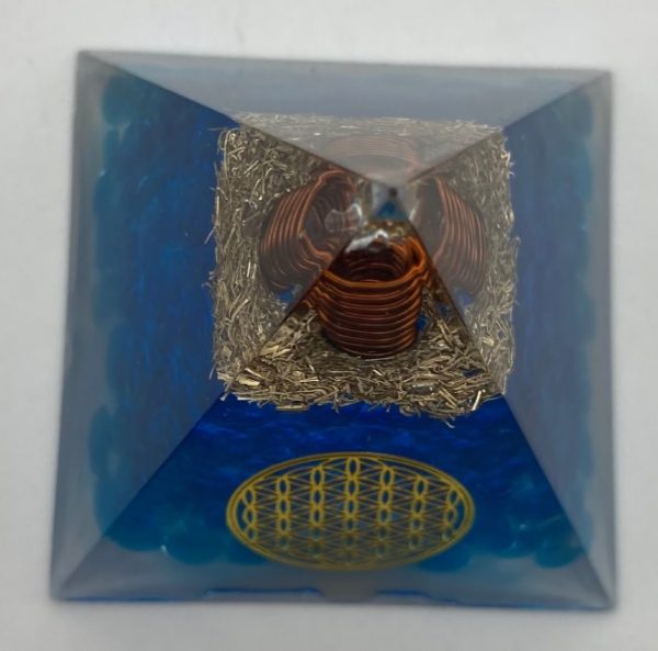 Piramide in Orgonite con spirale in rame, Fiore della Vita e chips in Acquamarina, cm. 5,2 x 5,2 h 5,6.