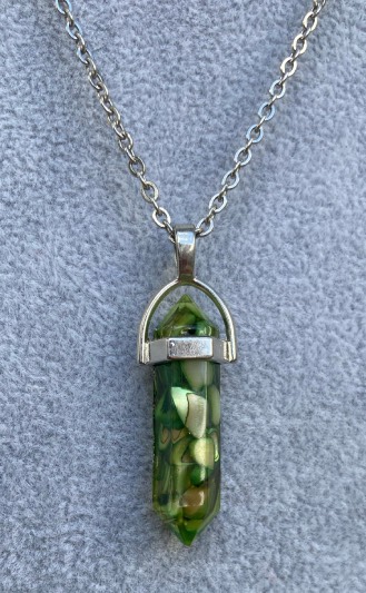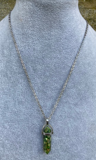 Collana in acciaio inox e ciondolo a bacchetta con montatura in metallo, e scaglie in Agata Verde con resina trasparente cm. 1 x 4.
