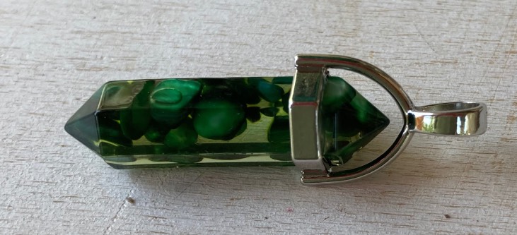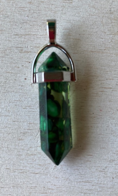 Collana in acciaio inox e ciondolo a bacchetta con montatura in metallo, e scaglie in Agata Verde scura con resina trasparente cm. 1 x 4.