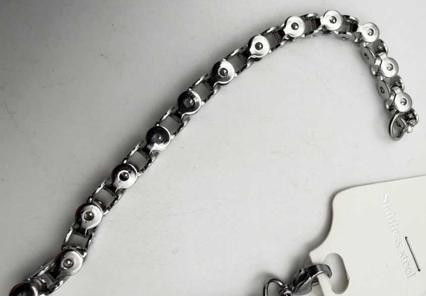 Braccialetto unisex in acciaio inox, con blocchetti continui da mm. 5 x 5, chiusura con moschettone, misura cm. 23.