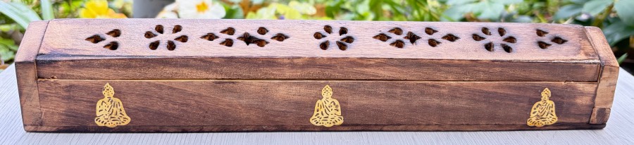 Porta incenso in legno, cassettina orizzontale, per bastoncini e coni, con ornamenti dorati statue Buddha, coperchio e scomparto sottostante, misura cm. 5 x 4,1 x 29,6.