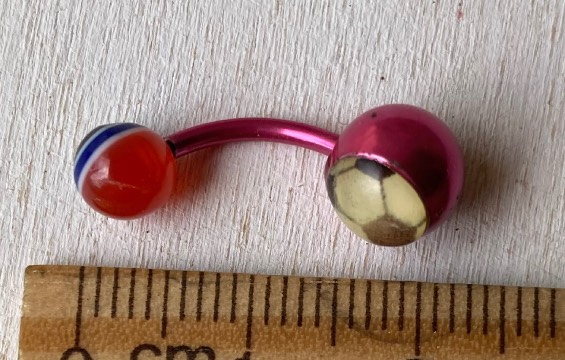 Piercing da ombelico con barretta in acciaio color fucsia, pallina in acrilico da mm. 6 con righe colorate e pallina con pallone da calcio, lunghezza totale mm. 21.