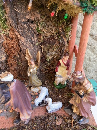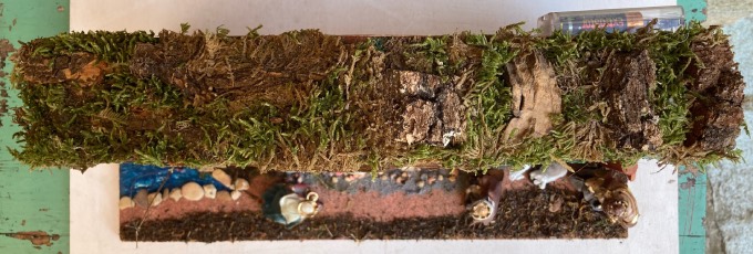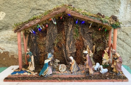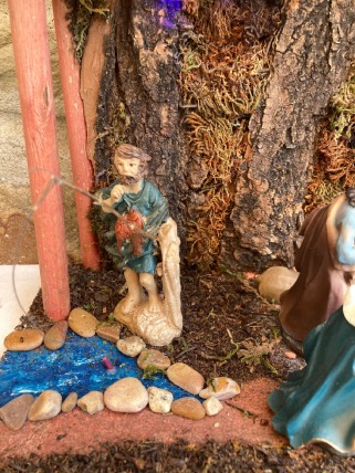 Presepe capanna, base e struttura in legno, muschio e cortecce, cm. 42 x 15 h 26. 11 personaggi in resina cm. 10, 2 pecorelle bianche, laghetto dipinto a mano, pescatore con canna da pesca costruita a mano con filo e bastoncino di Gelso, luci colorate a batterie con 2 stilo incluse.