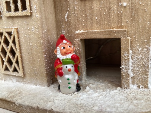 Casetta in legno con nano, addobbo natalizio.