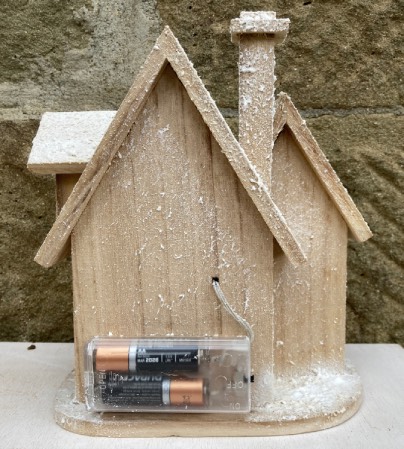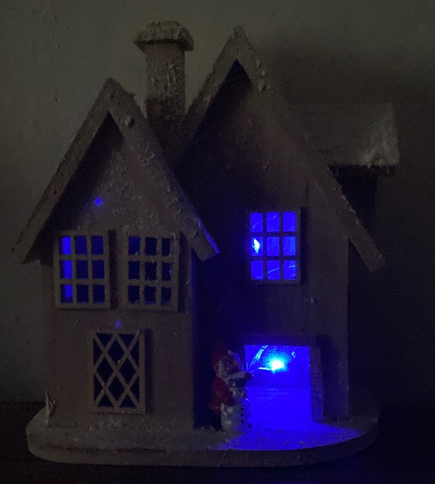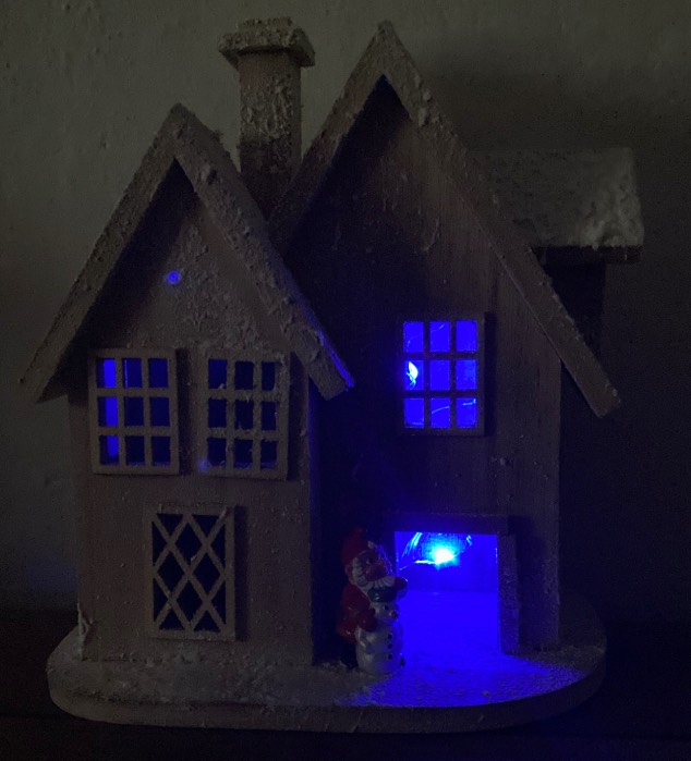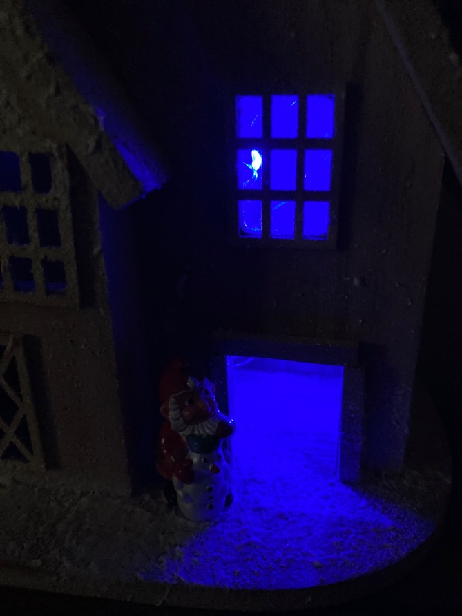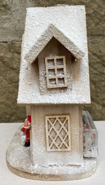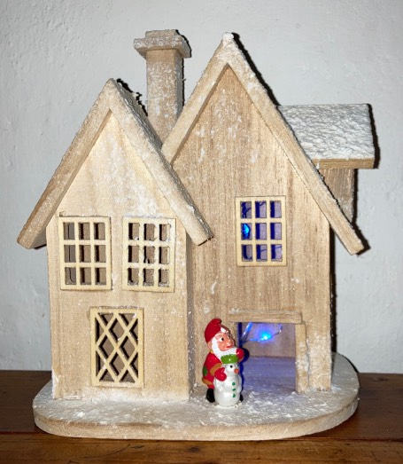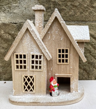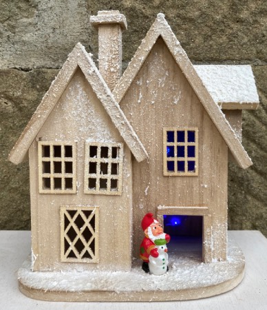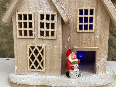Addobbo natalizio, base, casa innevata in legno con tetti e camino, porta, finestre e luci interne colore blu a batterie, nano con pupazzo di neve, artigianato personale fatto a mano.