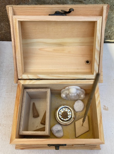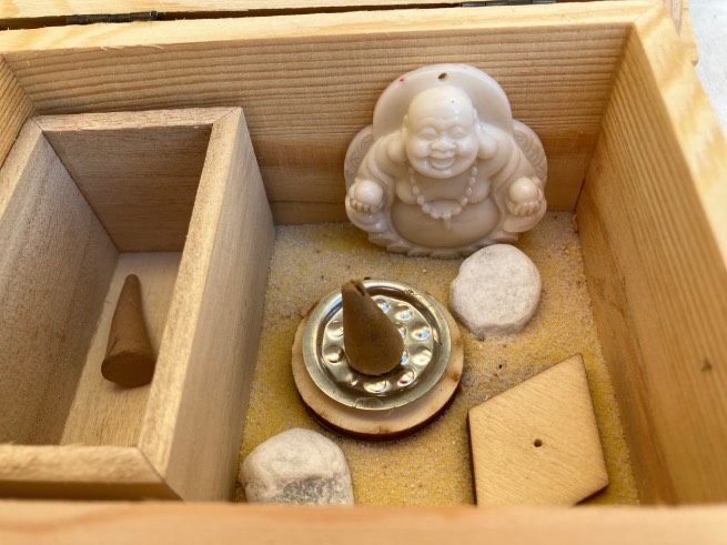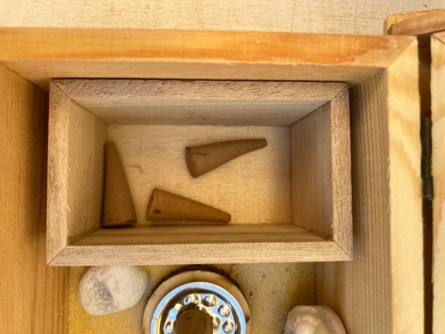 Porta incenso in legno, casetta con camino; all'interno sono presenti un vano per contenere i coni, piattino estraibile ancora per i coni, ( a casetta chiusa, esce il fumo dal camino ), forellino per i bastoncini, sabbia bianca e gialla, statuetta del Buddha della prosperità e abbondanza, sassi bianchi per una composizione zen, cm. 15 x 11,5 h 14.