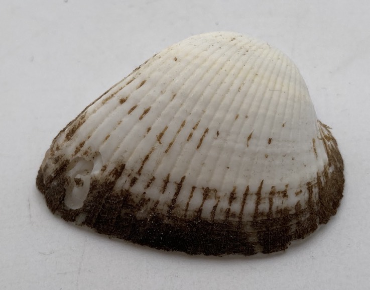Conchiglia da collezione, modello Cerastoderma Glaucum, colore bianco, grigio, misure cm. 4,5 x 3,7 x 1,7, con piccola scheggiatura.