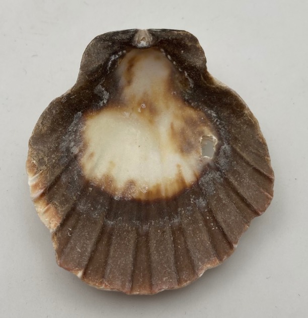Conchiglia da collezione, modello Cerastoderma Glaucum, colore bianco beige, misure cm. 5 x 5,6 x 1,5, con foro laterale per corrosione salina.