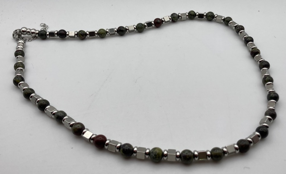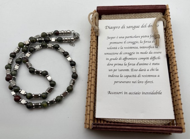 Collana in acciaio e sfere da mm. 6 in Diaspro Sangue di Drago, misura cm. 51 fino a 55.