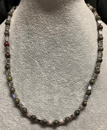 Collana con palline e distanziatori in acciaio, e sfere in pietra da mm. 6 in Diaspro Sangue di Drago, misura cm. 51 fino a 55.