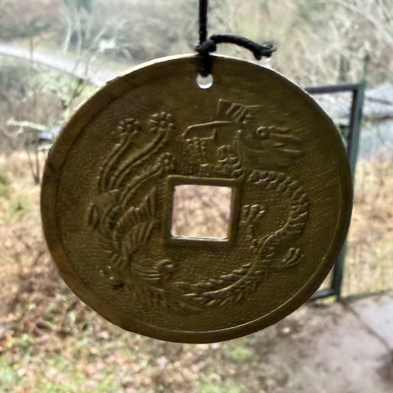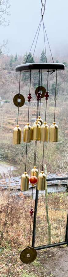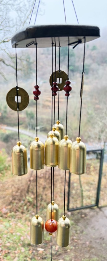 Campana eolica in rame dorato, disco in legno, 2 file di campanelle piccole, ciondolo con medaglione, lunghezza totale cm. 60.