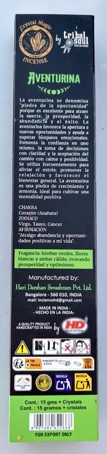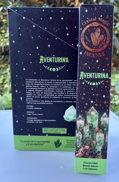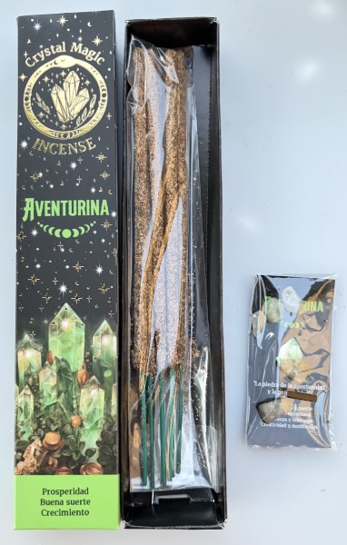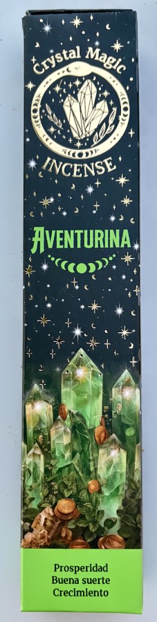 Scatola d'incenso in bastoncini, modello Crystal Magic Avventurina verde, confezione da gr. 15 di stick smudge, al profumo di erbe verdi, fiori bianchi e Ambra, con abbinate pietrine in Avventurina Verde :