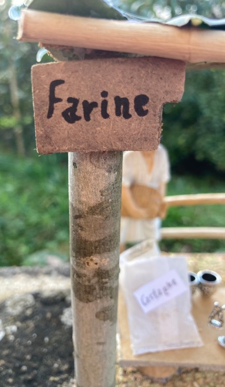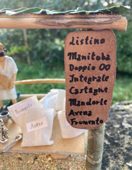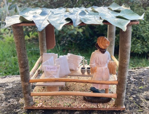 Scenario presepe artigianale, bancarella di vendita di farine varie, con personaggio in resina da cm. 10, base e struttura in legno, tetto in legno e foglie d'arancio, tritato verde misto per il pavimento, tavolino con sacchi di varie farine, oggettistica varia inerente in metallo, misure cm. 16 x 13 x 14, artigianato personale fatto a mano.