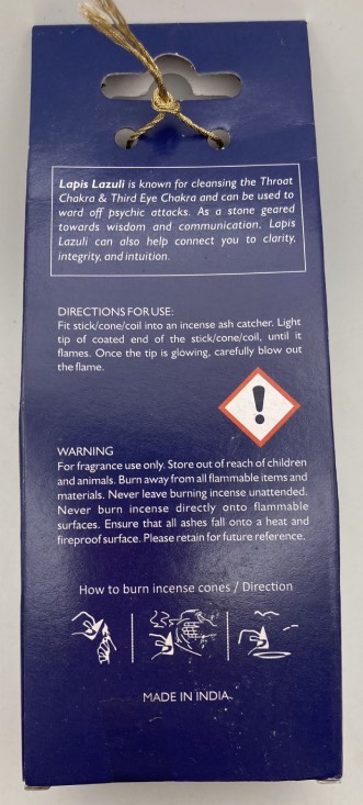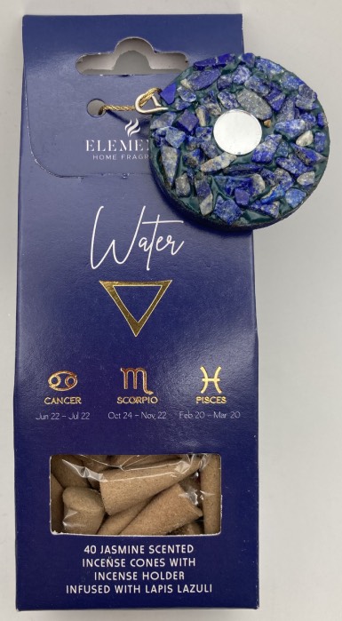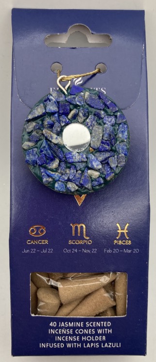 Confezione d'incenso con 40 coni al Gelsomino, porta incenso in legno colorato di blu con chips in Lapislazzuli, con vetrino centrale per il posizionamento del cono, adatto ai segni zodiacali del Cancro, Scorpione e Pesci, con Fengshui Acqua, marca Llunares Import India.