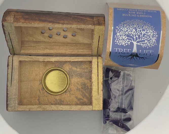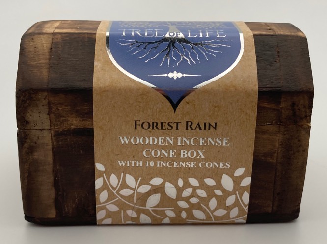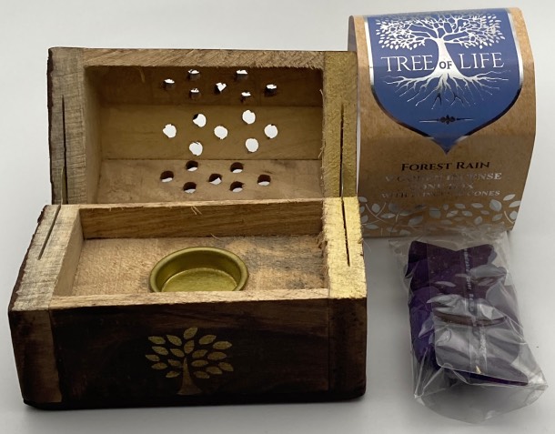 Cassettina box in legno, porta incenso per coni, cm. 5,5 x 6,5 x 10, con 10 coni in omaggio, profumo Forerst Rain, provenienza India.