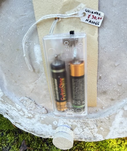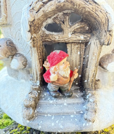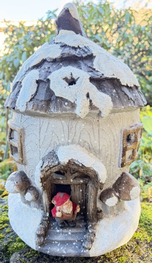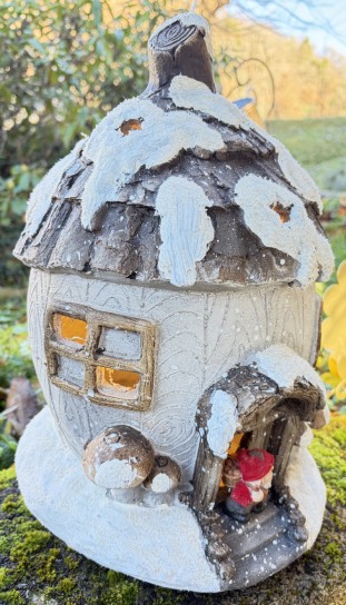 Ghianda in resina innevata, con luce interna a batteria, cm. 24 x 27 h 38, con nano sulla porta, per addobbi natalizi.
