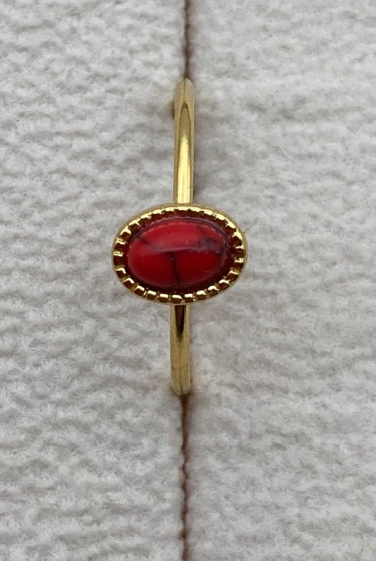 Anello in acciaio inox color oro, con pietrina ovale a Cabochon, in Howlite Rossa, misura regolabile.