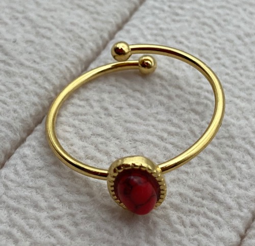 Anello in acciaio inox color oro con pietrina Howlite rossa a Cabochon, regolabile.