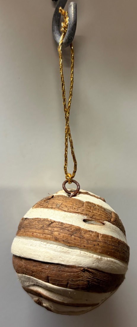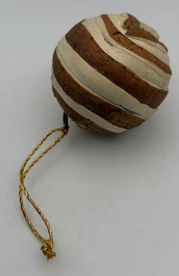 Pallina per albero di Natale cm. 4,5, con anima in polistirolo, ricoperta di materiale sintetico che riproduce linee in circonferenza, gancetto dorato, creata artigianalmente.