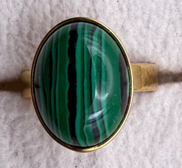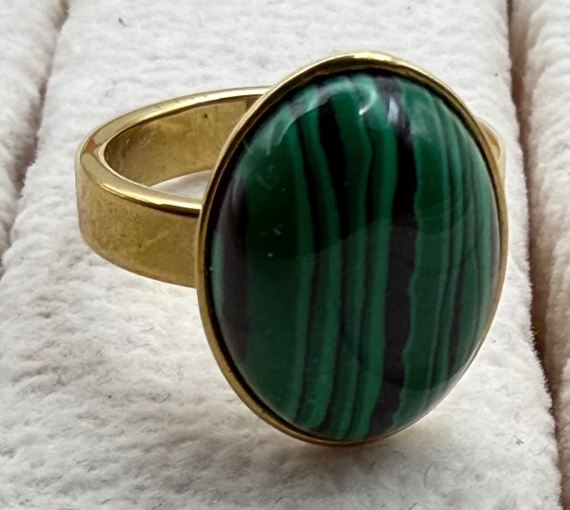 Anello in acciaio inox color oro, con pietra in Malachite, montaggio e taglio a Cabochon.
