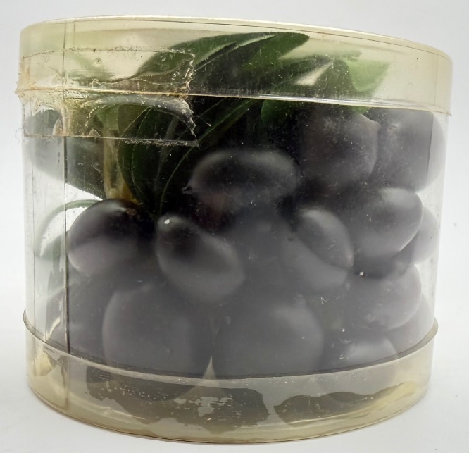 Confezione con olive nere e foglie finte.