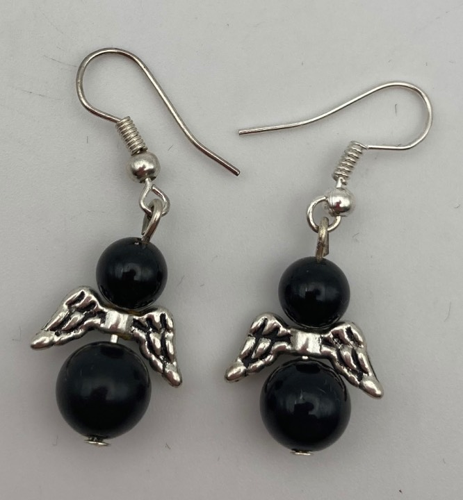 Coppia orecchini in pietra a forma di angeli, con sfere da mm. 6 e 8 in Onice, chiusura con monachella.