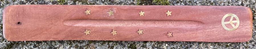 Porta incenso, per bastoncini, classica paletta in legno con decorazione dorata con simbolo della pace, misure cm. 3,5 x 26.
