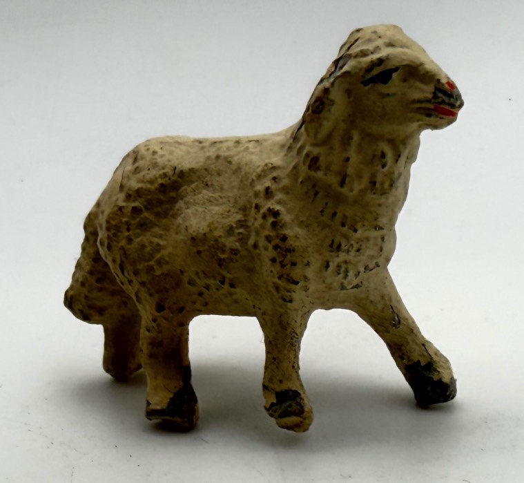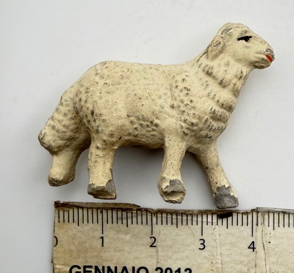 Statuetta presepe in terracotta, pecorella bianca in piedi con testa dritta, misure cm. 4,5 x 3,5, vintage periodo anni ' 70, condizioni accettabili.