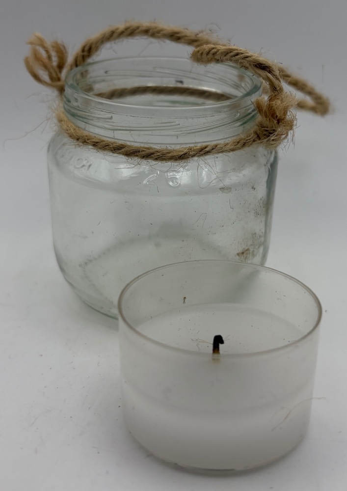 Porta lumino artigianale, con vasetto in vetro da cm. 6 x 6,5, con corda in yuta per essere appeso.