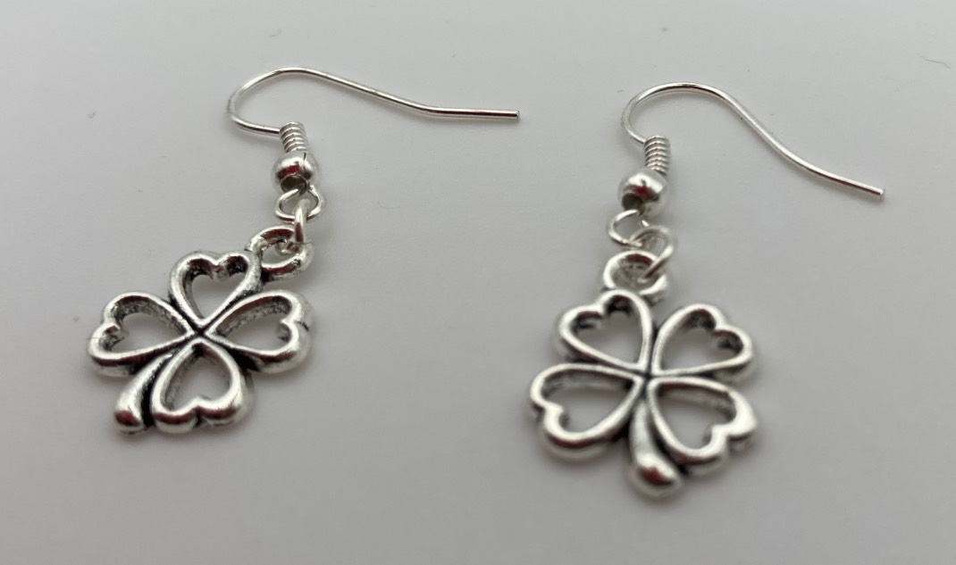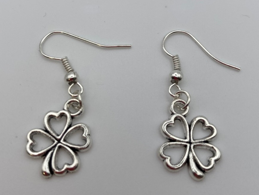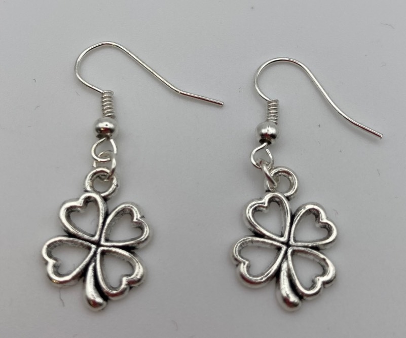 Coppia orecchini color argento, con ciondolo con quadrifoglio porta fortuna, mm. 13 x 13, chiusura con monachella.
