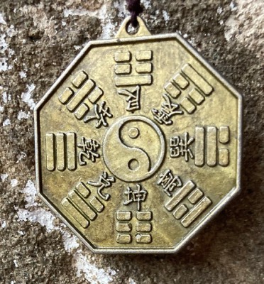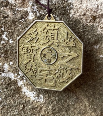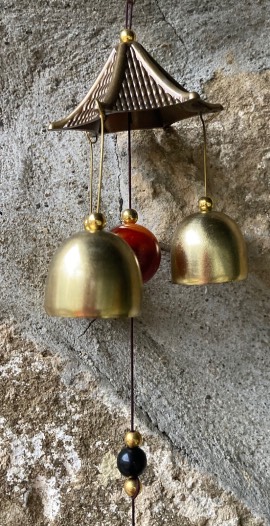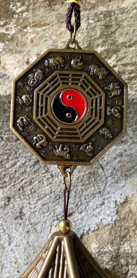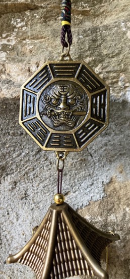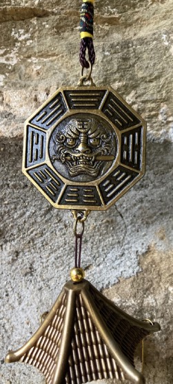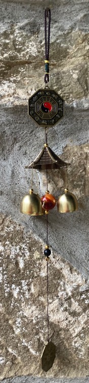 Campana eolica in ottone con ottagono e Ruota di Pa-Kwa, lunghezza cm. 46.