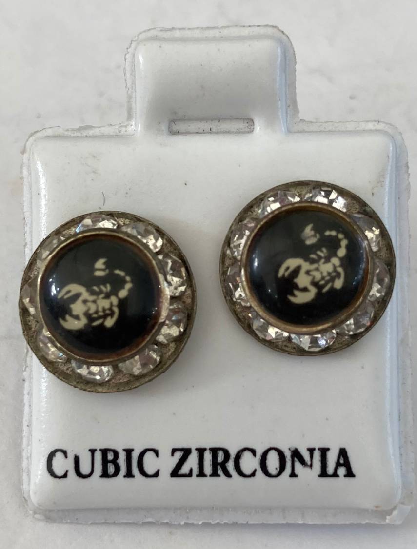 Coppia orecchini a bottone mm. 12, con strass bianchi e scorpioni bianchi su sfondo nero, chiusura con farfallina.