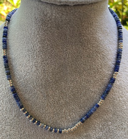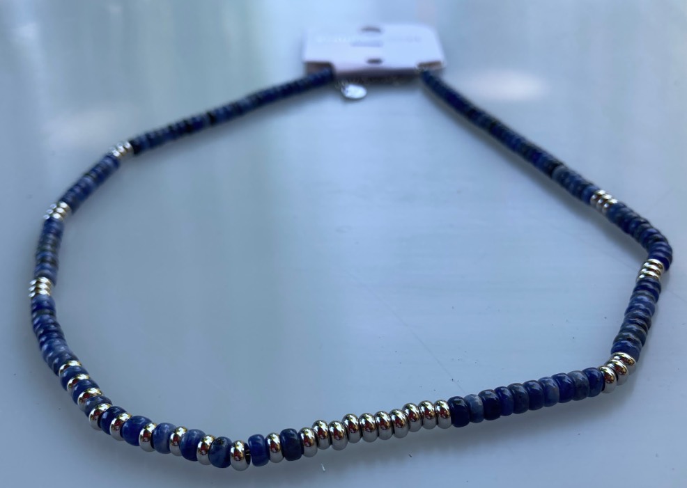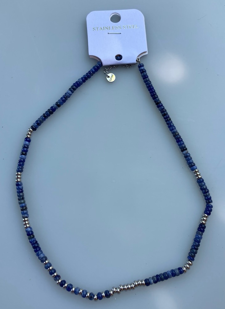 Collanina con cavetto, distanziatori ed accessori in acciaio, perline in Sodalite, misura da 47,5 a 53, chiusura con moschettone.