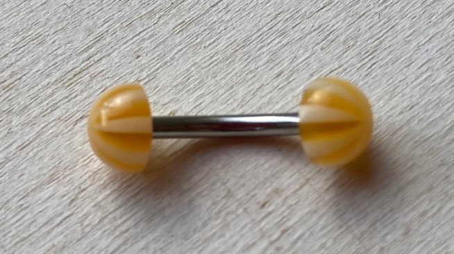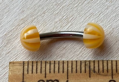 Piercing da ombelico con semisfere in acrilico da mm. 6 a spicchi arancio e gialli, lunghezza totale mm. 18.