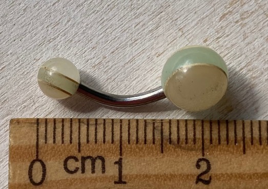 Piercing da ombelico con barretta in acciaio inox e palline in acrilico da mm. 5 e 8 con strisce colorate, lunghezza totale mm. 24.