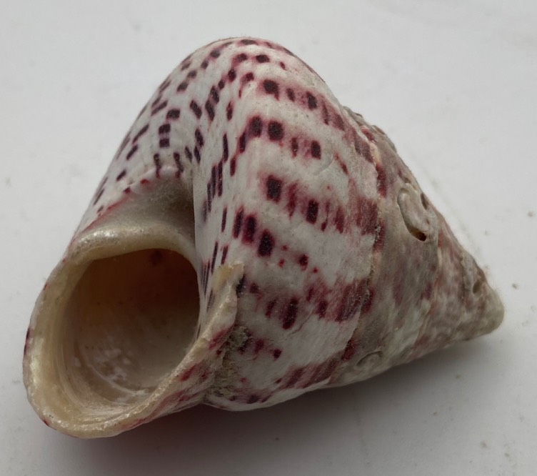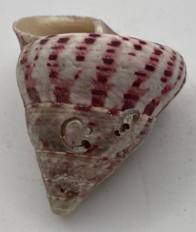Conchiglia da collezione, misura cm. 4,8 x 4,7 x 4,7, modello Trochus Maculatus, colore bianco e rosso.